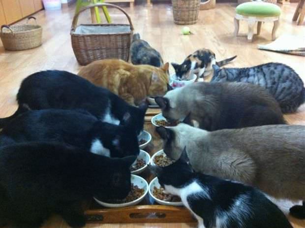 スタッフの方が、猫の数だけエサの皿を運んできました。