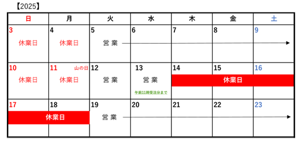 ※休業前の配達・発送は、8月13日(水)午前11時受注分までとさせていただきます。※8月19日(火)より通常営業となります。