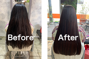 新メニューとして昨年の12月中旬から「酸熱トリートメント」をスタートしました。Before-Afterの写真を見比べていただければ、髪のうねりがなくなり、艷やかで収まりの良い髪になっているのが分かると思います。何より実際に体験された方の評判が非常に良くて、リピート率90%(取材時2020年2月中旬)、すでに3回やっていただいた方もいらっしゃいます。